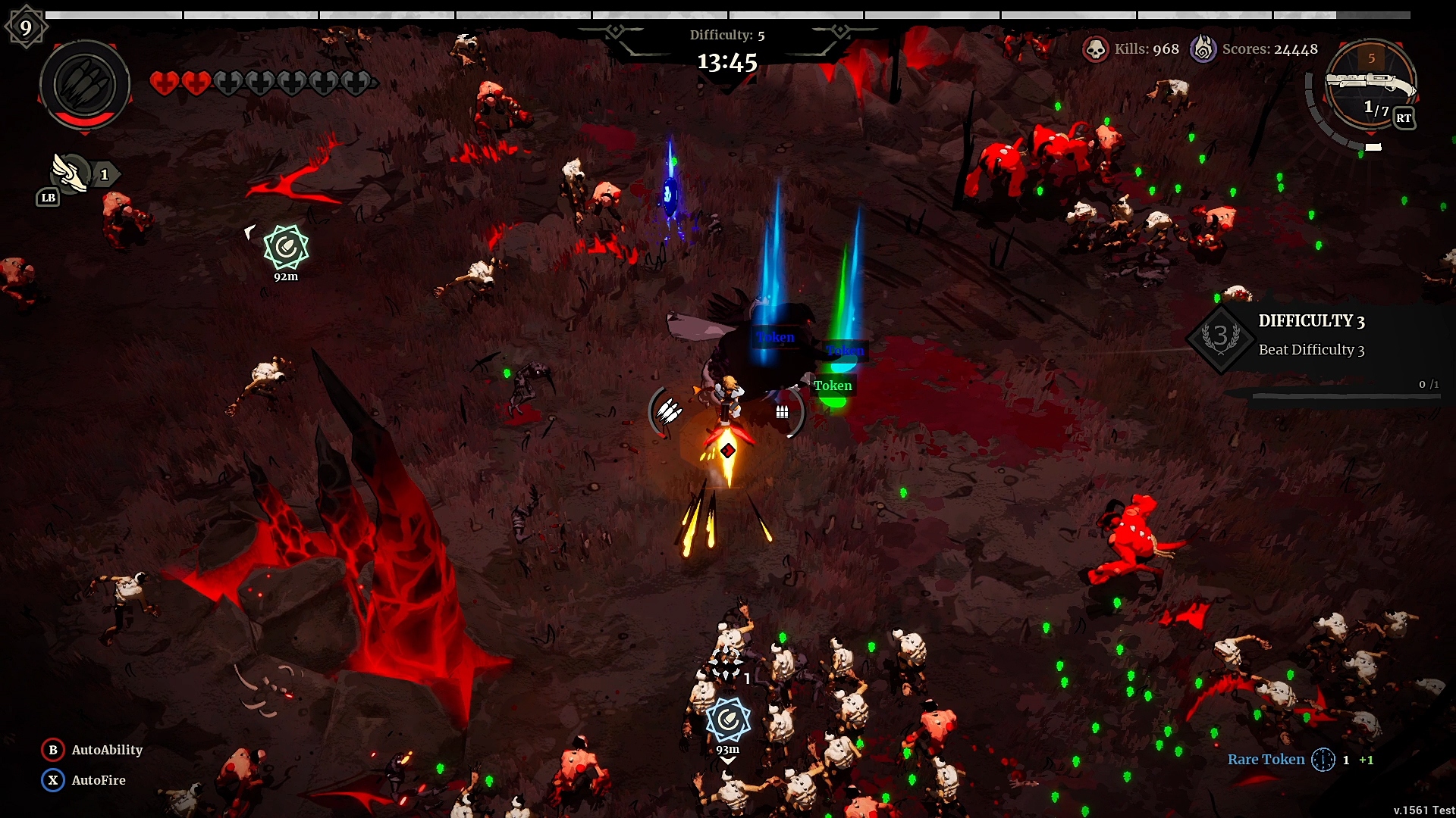 Der manuelle Modus spielt sich wie ein Twinstick-Shooter an. Was hier passieren kann, ist, dass man nicht immer genau trifft, da man keine Hilfe beim Zielen bekommt. Dadurch kann man genauer entscheiden, welche Gegner man zuerst besiegen möchte, vor allem bei Bossen ist das recht praktisch. Im Spiel kann man mit einem einfachen Knopfdruck zwischen den Modi wechseln.